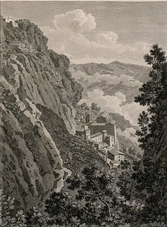 Laborde fixa una escena que avui, malgrat el turisme de masses, continua sent recognoscible: l’entrada al recinte. El pas cap al complex monàstic no és només un canvi d’espai, és un canvi de règim vital. L’hospici actua com una frontissa entre el món “normal” —el de les carreteres, els mercats i les guerres— i el món vertical.