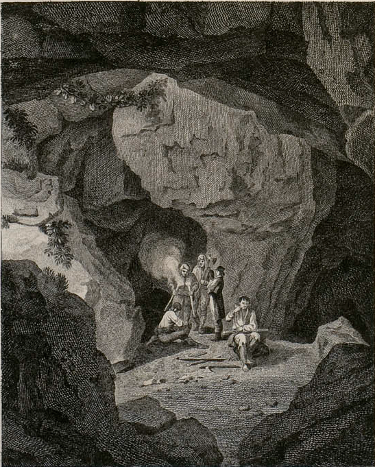L’exploració de Laborde no s’atura en els cims. Ell sap que Montserrat té un doble, un reflex fosc: el món subterrani. Les coves de Collbató, que ja en aquell temps començaven a ser una atracció per als esperits curiosos, completen el retrat. No n’hi ha prou amb pujar; també cal baixar. Les torxes, la humitat i el silenci mineral de les coves reforcen la idea central: la natura no et regala res. Si vols conèixer Montserrat, l’has de recórrer per fora i per dins.