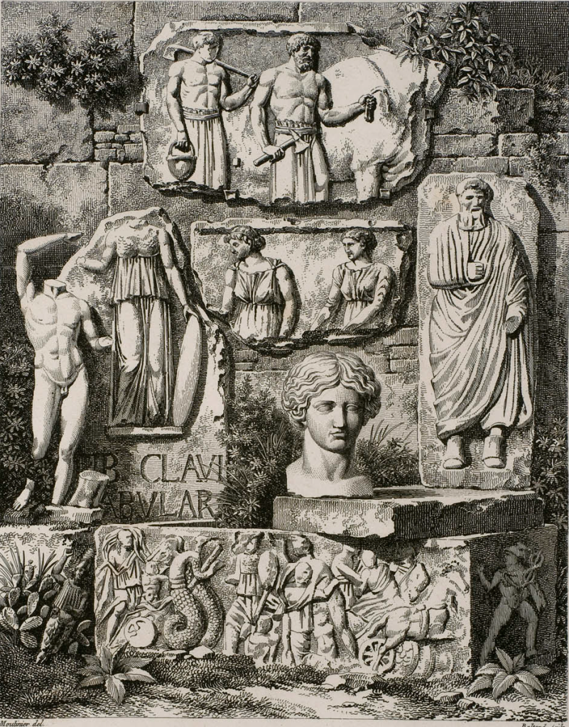 Laborde no construeix el seu retrat només amb grans monuments. També el fa amb restes disperses. Amb fragments escultòrics, sarcòfags, terracotes i peces antigues que apareixen com a proves d’un passat trencat però no esborrat.